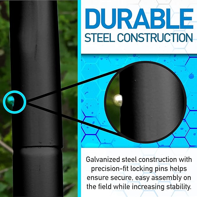 - DURABLE BLACK POWDER STEEL CONSTRUCTION: Powder coated steel construction with precision-fit locking pins helps ensure secure, easy assembly on the field while increasing stability.