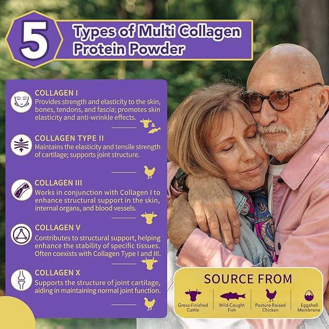 - ✅HYDROLYZED MULTI COLLAGEN COMPLEX:Patented Formula, Efficient Absorption. Per serving provides 10g hydrolyzed multi collagen complex that contains bovine collagen peptides, fish collagen peptides, avian Sternum Cartilage, eggshell membranes, (Type I, II, III, V, X)