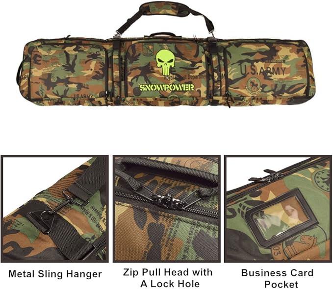 - Design: Great functional Boardbag. Suitable for boards with binding. Three fixed points, ski single and double board are universal.There is another padded, adjustable and detachable shoulder strap that allows you to hang the bag over a shoulder (like a "rifle").