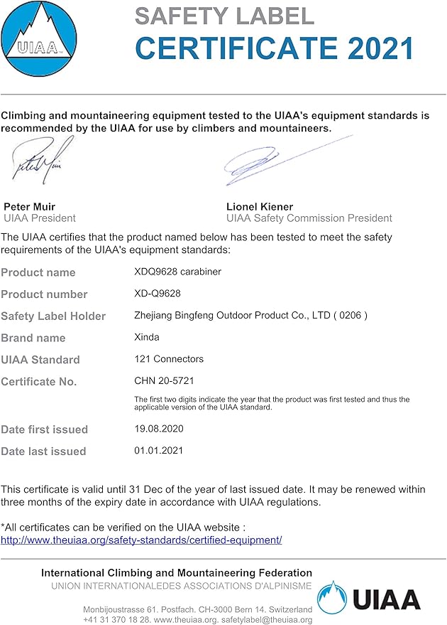 - Heavy Duty Carabiner: Major axis: 25KN (5500lbs), Minor axis: 8kN, Open gate: 7kN, CE/UIAA certified.(Tips:The rating on the carabiner is a result based on the lab test,which might vary in practice.)