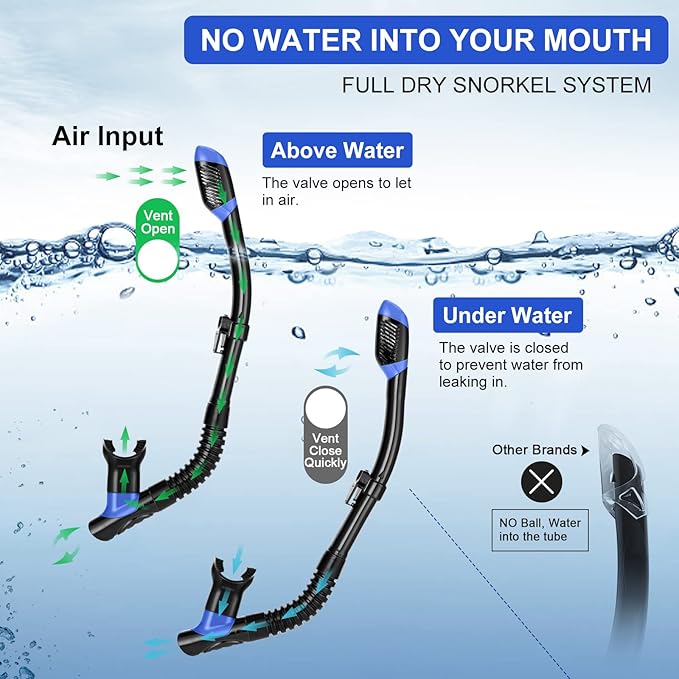 - Anti-Fog & Anti-Leak: The dry snorkel has a closing valve which seals the tube automatically as you dive while it allows air to easily enter snorkel for relaxed and unobstructed breathing when on water surface. It will keep water out when you dive under the water surface.