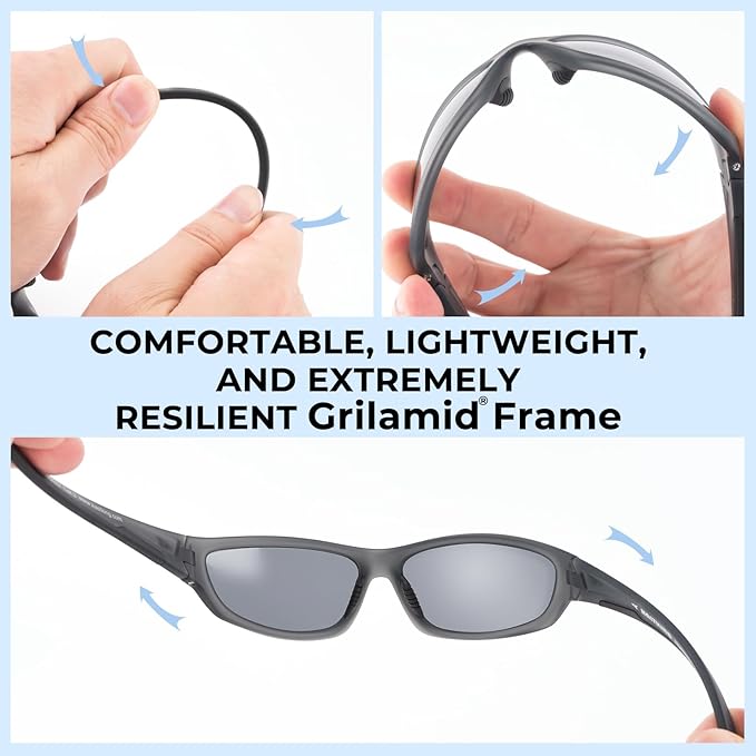 - KEY FEATURES - Polarized lenses reduce glare - Impact resistant TAC lenses protect your eyes from flying objects - Lightweight, durable, and comfortable Grilamid frames – Anti-slip nose and temple pads - Block 100% of the harmful UVA and UVB rays