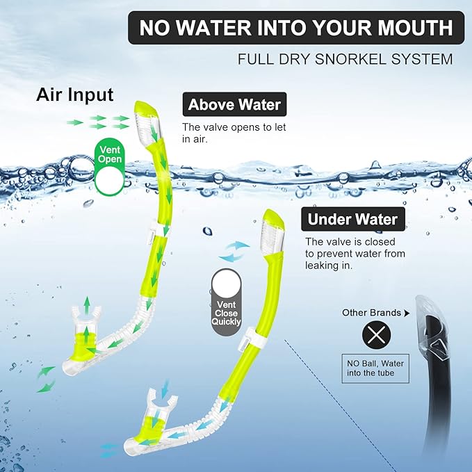 - Anti-Fog & Anti-Leak: The dry snorkel has a closing valve which seals the tube automatically as you dive while it allows air to easily enter snorkel for relaxed and unobstructed breathing when on water surface. It will keep water out when you dive under the water surface.