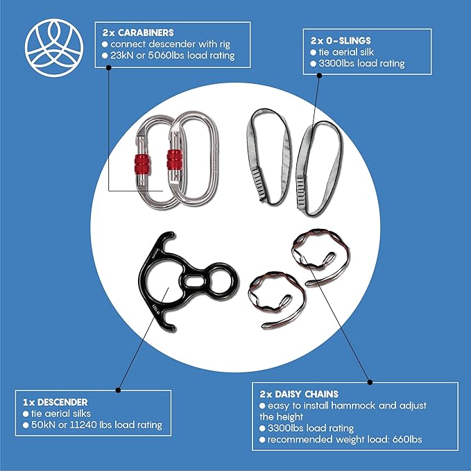 - ✔ ALL YOU NEED: Includes complete set of aerial silk (9 yd), 1 figure 8, 2 carabiners, 2 extension straps (3 ft), 2 o-slings, and a manual guide. We got everything you need!