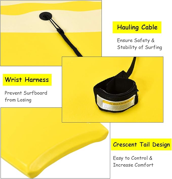 • 【High-quality & Durable Materials】The surface of our bodyboard is the XPE deck, which has good impact resistance and durability. EPS core is weather resistant, waterproof and shock absorbing. And the high-density polyethylene slick bottom adds stiffness and increases speed, projection and ideal flexibility.