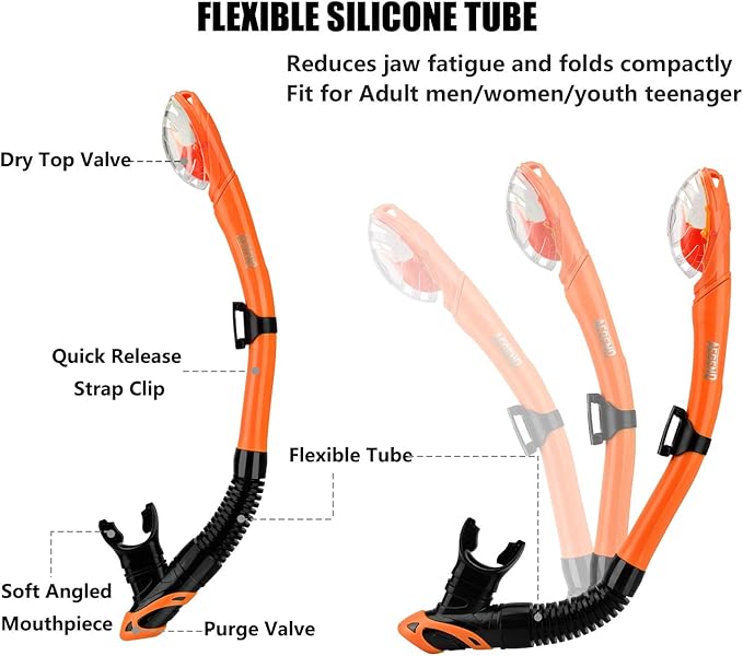 - Advanced Dry Valve and Splash Guard: The innovative dry top valve automatically seals when submerged, effectively blocking water entry. The splash guard further protects against waves, while the advanced design prevents clogging from sand or debris, ensuring consistent and comfortable breathing.