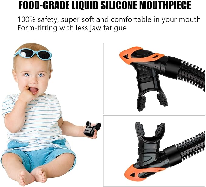 - Effortless Breathing with a Longer, Curved Tube: Our snorkel's larger-diameter oval upper tube delivers unrestricted airflow, letting you breathe naturally and comfortably. The curved design fits closely to your head, reducing drag and improving ease of movement—perfect for snorkeling, skin diving, scuba diving, and swimming.