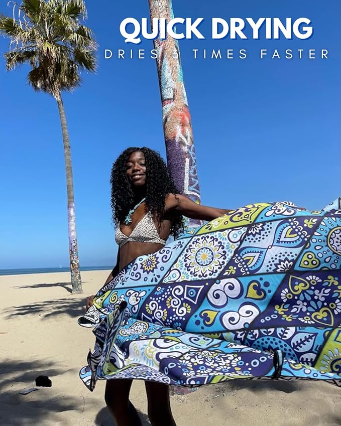 - EXTRA LARGE SIZE YET COMPACT FOR TRAVEL - This beach towel is oversized, providing ample space for lounging. Despite its big size, the travel towel is lightweight and compact taking up minimal space in your beach bag. Easily fits into the included pouch for packing during any vacation.