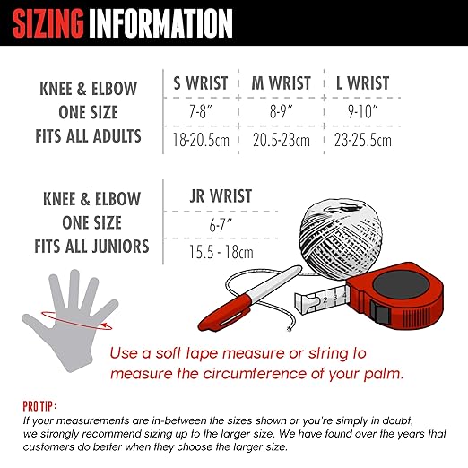 - Find Your Perfect Fit: Size determined by wrist guards (measure around the hand at knuckles): Junior fits 6.0-7.0 inches, X-Small fits 6.5 - 7.5 inches, Small fits 7.0-8.0 inches, Medium fits 8.0-9.0 inches, and Large fits 9.0-10 inches.
