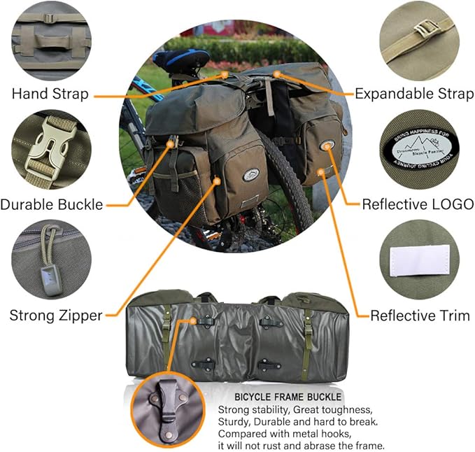 - 【50L Large Storage Capacity】This DREAMOON bike panniers has a 40L capacity, with each side holding 25L(Size:20.9''L x 13.0''W x 13.8''H, Up to 35 KG loading weight capacity)