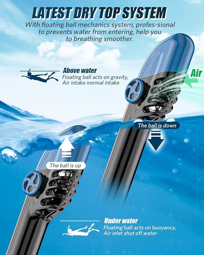 - PROFESSIONAL ANTI-FOG & ANTI-LEAK DESIGN: Separate inhaling and exhaling channels stop the top snorkel mask from fogging up, and anti-fog coating on the lens and anti-fog inserts guarantees anti-fog effect; Advanced leak-proof silicone sealing mask with floating ball prevents salty water from entering in mask.