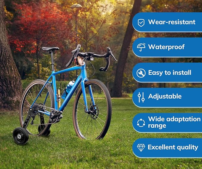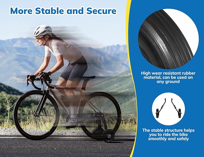 - DURABLE RUBBER】The bicycle training wheels are made of high quality rubber and iron with extra thickness which is anti-slippery and wear resistant. It creates a safer condition for kids to ride without fears.