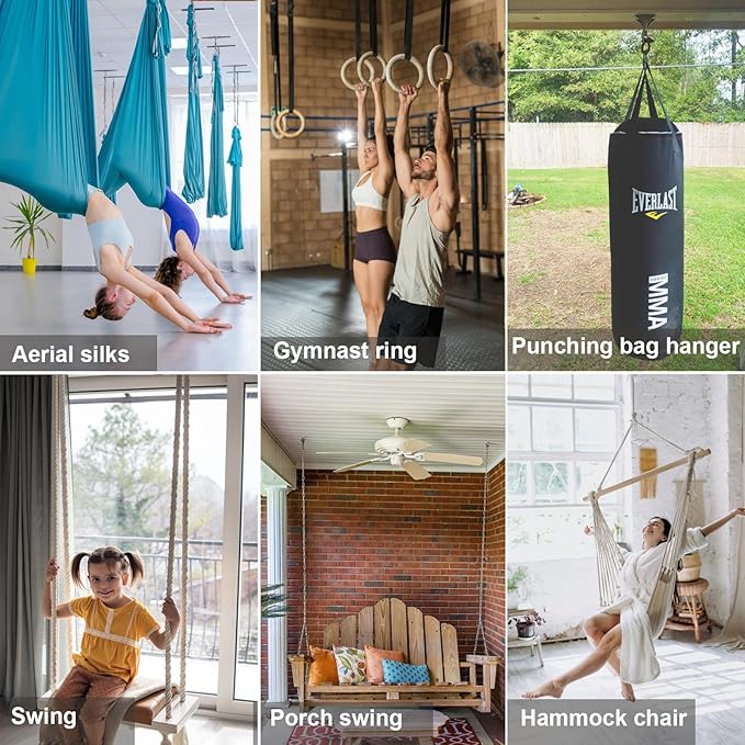 - 🥊USE: The heavy bag hooks is compact design ensures minimal space usage, ideal for home gyms, garages or rooms. You can hang boxing bags, speed bags, aerial yoga, swings, swivel seats, hanging chair, porch swing or any other swings.