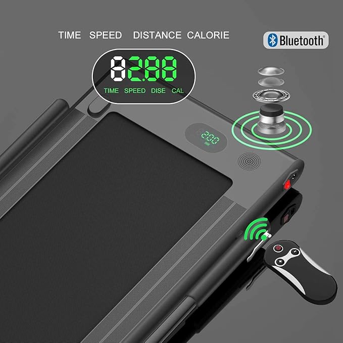 - WITH APP CONTROL, BLUETOOTH SPEAKER, PHONE HOLDER & REMOTE CONTROL — APP control is perfect to record exercise data. Connect the treadmill to your phone through Bluetooth, so you can play music while you are exercising. You can also use the phone holder to watch videos or chat with friends. The remote control (BATTERY NOT INCLUDED) is convenient to adjust the speed of movement and stop instantly. Equipped with a safety key to shut down immediately in an emergency to protect your safety.