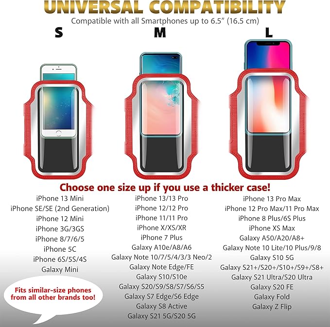 - [There's No Comparison] Our premium sports cell phone armband is designed to comfortably fit all Apple iPhones, Samsung Galaxy, Android, Pixel, LG, Moto, Huawei and other smartphones similar in size and dimensions. Accommodates all phone cases, too, including Otterbox, Lifeproof. Just size up if you're using a thicker phone case.