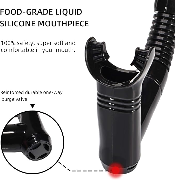 - 🏊♀️Food-grade Mouthpiece & Optimized One-Way Purge Valve-Super soft and safe material for the mouthpiece, very comfortable in your mouth and provides a good seal. form-fitting with angled and corrugated mouthpiece design, allowing for prolonged use. The purge valve has professional protective parts and is not easy to lose and shake.