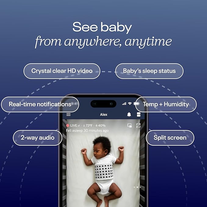 - Always-on monitoring: Check on baby from anywhere with 1080p HD video livestream, hear and speak to baby with 2-way audio monitoring, and view up to two cameras at once with Split Screen, which lets you add an additional camera for expanded smart monitoring capabilities. Enjoy features like night vision, sound + motion alerts, tracking temp + humidity of baby’s room, and soothing baby to sleep with a selection of nature sounds, white noise, or lullabies.