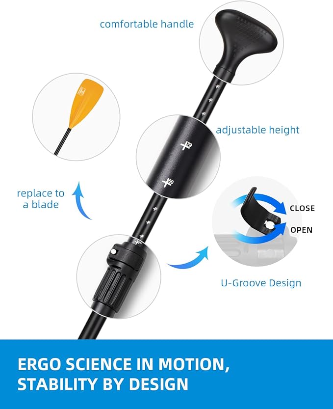 • ANTI TWIST SHAFT DESIGN: The adjustment handle section and the extra kayak paddle blade are with anti-twist groove design. So it's easier to use, especiall it saves you the trouble to line up the handle section of the extra blade when converting the paddle. *Note: The screws on the clamps need to be checked and tightened up if needed before using.