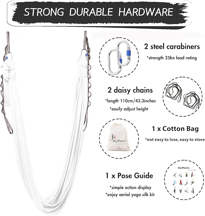 - HEAVY-DUTY HARDWARE - The flying yoga hammock includes ALL THE HEAVY-DUTY hardware required to safely install it yourself. You will get 5.5 yards aerial silk, 2 x daisy chains,2 x Steel Carabiners, 1 x Pose Guide, 1 x carry bag. They are strength and safety certified with high weight-load capacities.