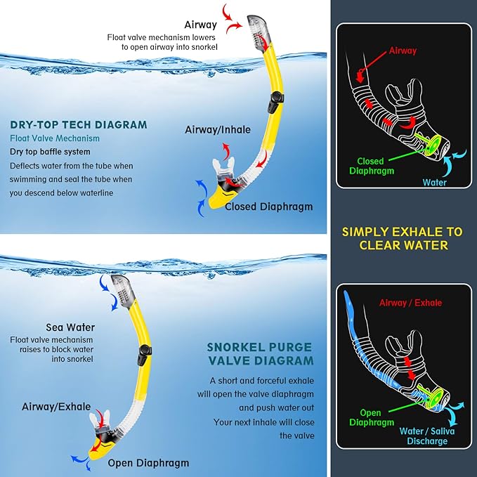 - Unobstructed breathing dry top snorkel: a high-quality snorkel with a dry-top valve that seals the breathing tube when submerged. dry top snorkel is designed to keep water from entering the breathing tube, ergonomic silicone mouthpiece is comfortable and durable. Lower purge valve allows water to be quickly expelled, so you can enjoy easy and unobstructed breathing while diving underwater.