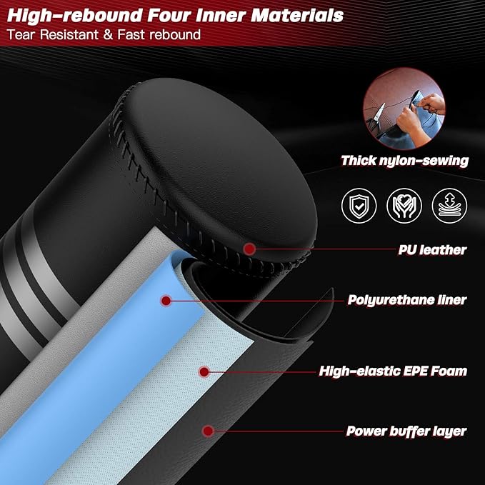 - Quality Four Inner Materials and Stitching: Features with thick and high-density PU leather, power buffer layer, high elastic EPE Foam and polyurethane liner. Top-filled terylene cotton enhances plumpness, thick nylon-sewing makes every boxing more pleasant. Together with boxing gloves, not to hurt fingers and elbow joints