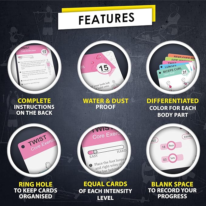 - Customize Your Workout - Never get bored rather tweak your exercise routine with the ease of designing your own schedule, using our unique workout " Recommendation Cards ". Keep a track of your progress using the starter Dry-Erase marker included in the Box.