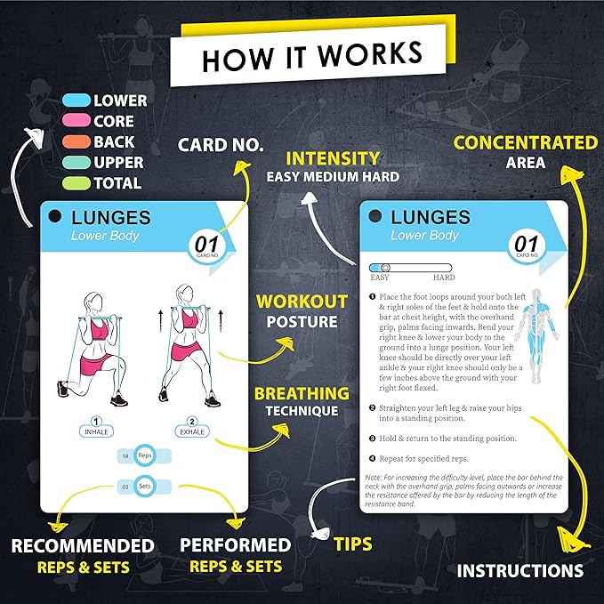 - User Friendly - The Deck includes 5 distinct color cards, representing workout of each body part. Every Card illustrates the focused muscles & also indicates the intensity level from easy to hard making it ideal for a beginner to an expert.