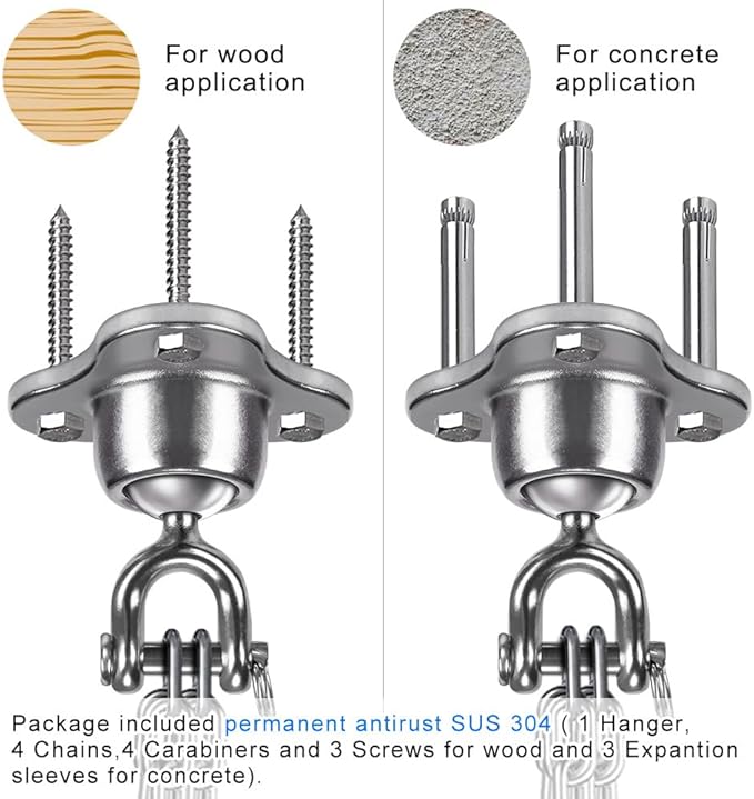 - 【What You Get】One swing hanger with chain and carabiners, 3 screw for wooden set and 3 expanded iron tube for concrete ceiling