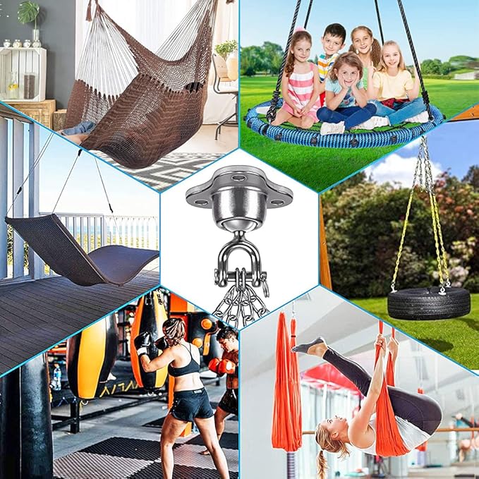 - 【Durable Use】Heavy duty heavy bag chain hanger has 3 mounting holes that use triangular balance design, improved stability and safer than 2 holes installed, can support up to 900 pounds. Anywhere You Need Dependable, Smooth Rotation Without Twisting Chains. The silent ball bearing swing hanger bring you a silent high-intensity training process