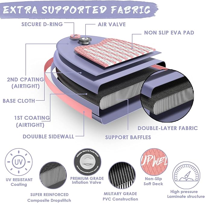 - 【PREMIUM MATERIALS】Our boards are made of quality military grade materials. Ultralight double wall PVC is 25% lighter than other same size products. Meanwhile, this reinforced lightweight fabric creates a firmness, anti-corrosion, wear-resistance sup board which can be used for years. Soft non-slip EVA deck pad makes you feel comfortable while ensuring your stability and safety when you stand for a long time. UPWELL paddle board is your choice for water sports.