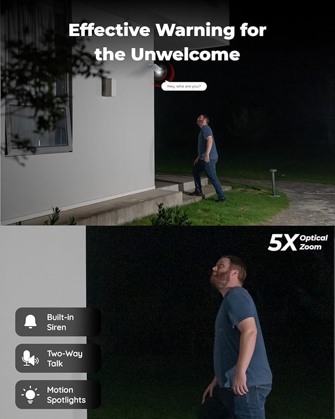 - 4K Ultra HD & 5X Optical Zoom & 123° Wide Angle: The varifocal lens allows you to 5X zoom in on the distant object without compromising the 8MP resolution. Cover almost every angle with the built-in wide 123° viewing angle (H: 105°, D: 123°), allowing you to keep an eye on what matters most.
