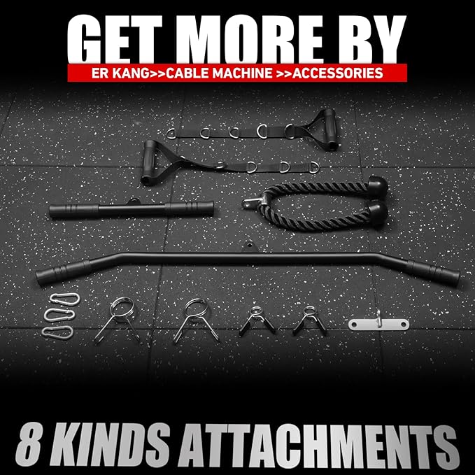 - 【DESIGNED FOR HOME GYM】Big footboard on the Base-perfect attachment for the seated cable row. Upward 10° of Weight peg can prevent weight plates slip off. It also comes with detachable sleeves to fit 1''/2'' plates. Special four buckles strap handles can let you easily adjust the length you want. Also, this machine comes with 3 additional attachments: Lat bar, Cable bar, and Tricep rope.