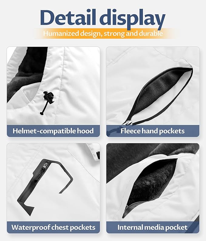 - ❄ Functional Pockets--Snowboarding jacket with waterproof chest zipper pocket(ski pass pocket), 2 zippered micro fleece handwarmer pockets. Internal media pocket with media port. Internal large pocket can put ski goggles, water glasses.