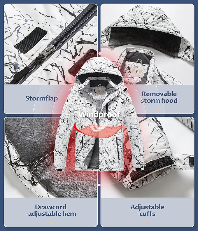 - ❄ Humanized Design--This windbreaker snowboard jacket with Adjustable helmet-compatible hood, smoothly taffeta liner arm design makes the movement more flexible. Durable tear resistance Armpit design.