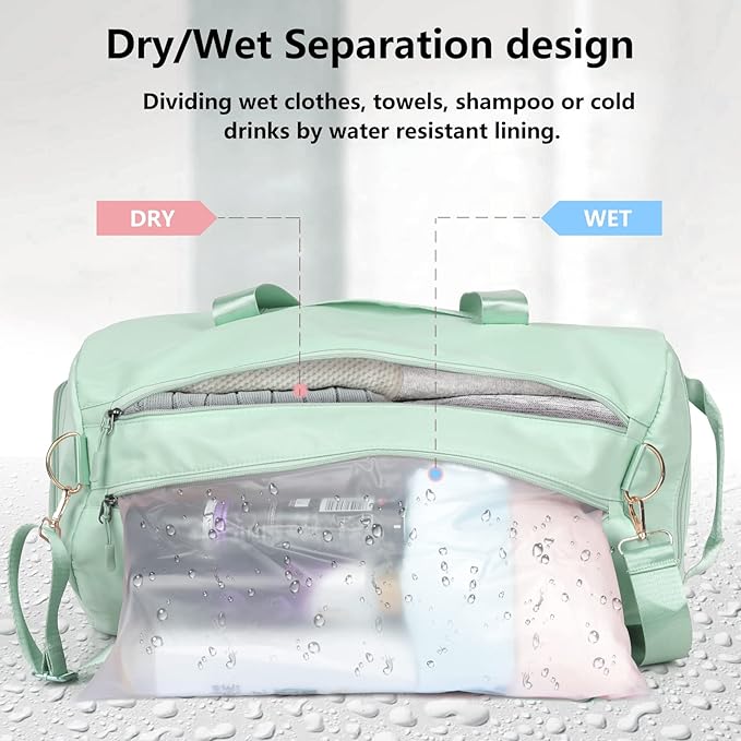 - DRY WET SEPERATED DESIGN & SHOE COMPARTMENT: The high density waterproof pocket can help you to divide wet clothes, towels, shampoo or cold drinks. Built-in shoe compartment keeps your shoe storage private and fresh. Additional storage pockets to organize your items and necessities.