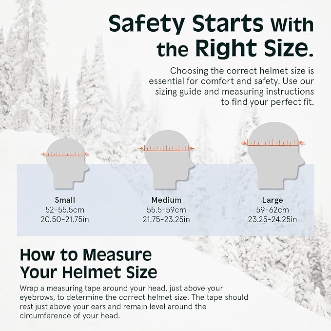 - Sizing To determine the correct ski helmet size, wrap a measuring tape around your head. The tape should rest just above your ears and remain level around the circumference of your head. S: 52-55.5 cm, M: 55.5-59 cm, L: 59-62 cm