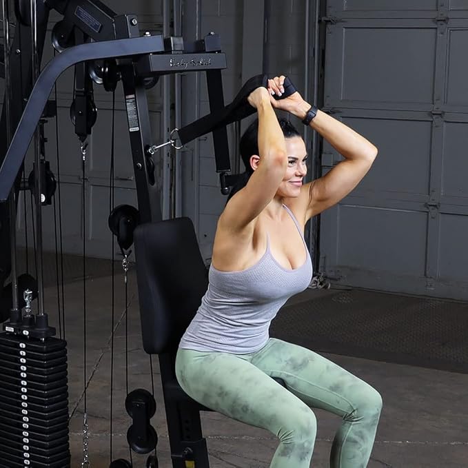 - INCLUDED ATTACHMENTS: Fully adjustable single-stack home gym workout machine featuring a no-cable change design lat pull down bar, low row bar, leg press bar, ab harness comfortable multi-position handgrips and adjustable hold-down pads to target several muscle groups (abs, biceps calves, delts forearms, glutes hamstrings, lats lower back, obliques pectorals, quads shoulders traps, tricepts and total body).