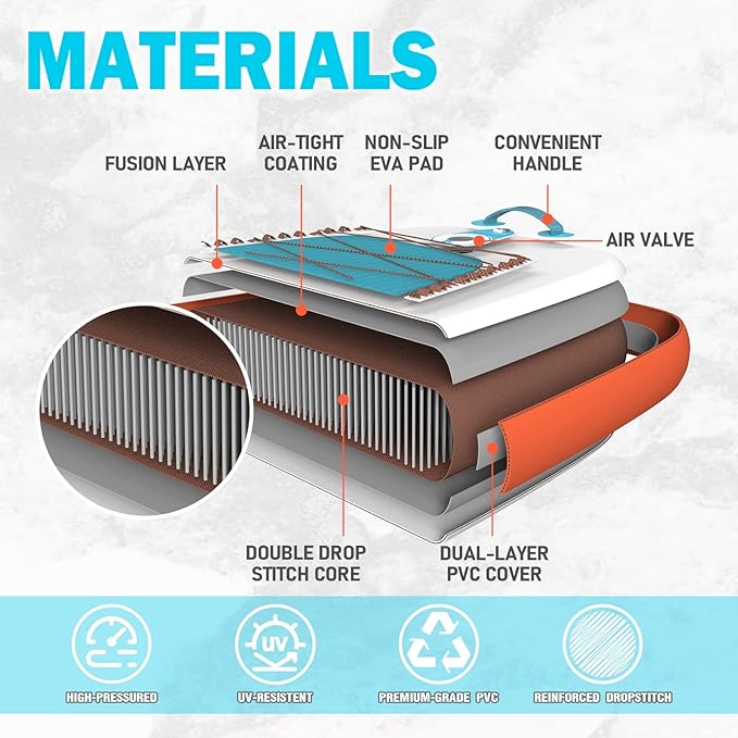 - 【Package Including】1 inflatable paddle board, 3-piece length adjustable floating paddle, 3 fins, 1 SUP pump, 1 backpack, 1 10L Dry Bag, 1 leash, 1 shoulder strap, 1 kayak seat, 2 fishing rod bracket.