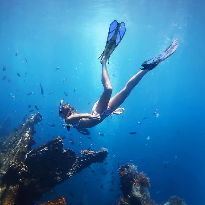 - Full mask fin snorkel set: zeeporte long snorkel set with adjustable fins, two window tempered glass lens mask, dry top silicone snorkel, travel gear bag, it's the ultimate travel companion and is suitable for snorkeling, swimming, body surfing, boogie boards and much more.