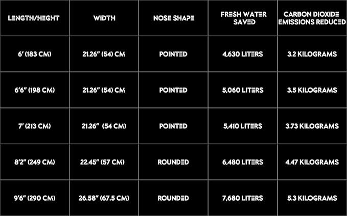 - 📐 Pointed Nose Shape (shorter boards): 6', 6'6", 7' ; Rounded Nose Shape (long boards/fun boards): 8'2", 9'6" (See sizing chart below)