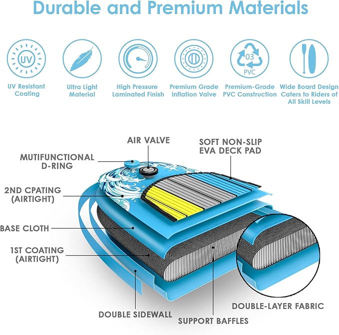 - 【PREMIUM MATERIALS】Our boards are made of the highest quality military grade materials. Ultralight double wall PVC is 25% lighter than other same size products. Meanwhile, this reinforced lightweight fabric creates a firmness, anti-corrosion, wear-resistance sup board which can be used for years. Soft non-slip EVA deck pad makes you feel comfortable while ensuring your stability and safety when you stand for a long time. UPWELL paddle board is your optimal choice for water sports.