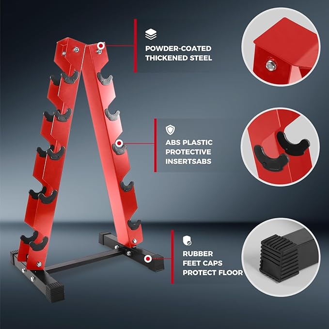 - Compact and Space-saving Rack: This weight rack features a heavy-duty construction with incredibly compact three-tiered design, allowing you to place it anywhere for your easy accessibility. Three angled horizontal shelves offer efficient barbell loading and retrieval. The solidly welded triangular base, with four non-skid feet, reinforces its overall structural stability. In addition to dumbbell storage, this rack can store kettlebells, medicine balls, yoga blocks, etc.