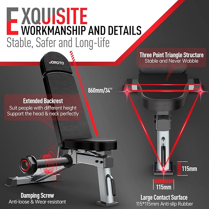 - [1000LB Safe Capacity & Heavy Duty Frame] – Built with 77×70×2mm commercial steel, dual back support tubes, widened stabilizers, and a reinforced triangular design, this JOROTO MD80 weight bench delivers up to 1000 lbs safe capacity (tested to 1200 lbs). Perfect for serious lifters who need maximum stability.