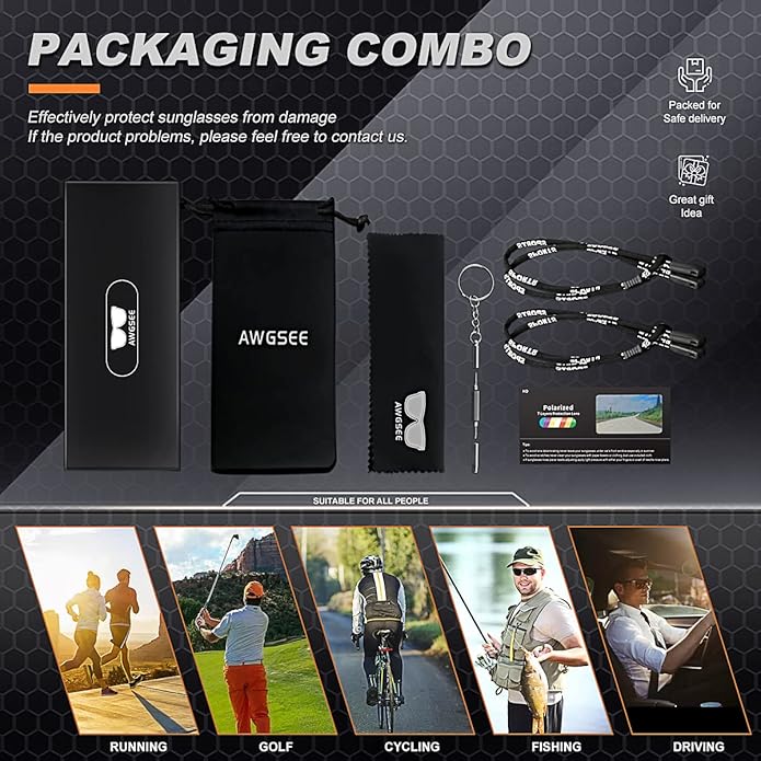 • USE OCCASIONS ► AWGSEE polarized sunglasses help reduce glare and provide extra clarity while keeping your eyes protected. Is ideal for usage by motorcycle and cycling, driving, running, fishing, climbing, golf, trekking or other outdoor activity enthusiasts.