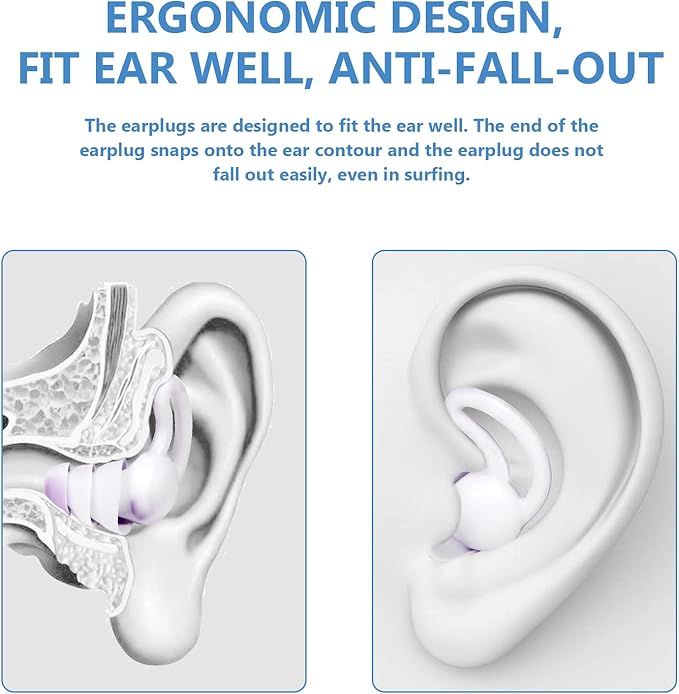 - Ergonomic design & anti-fall-out. The earplugs are designed to fit the ear canal well and the end of the earplug snaps onto the ear, so they do not fall out during sports.