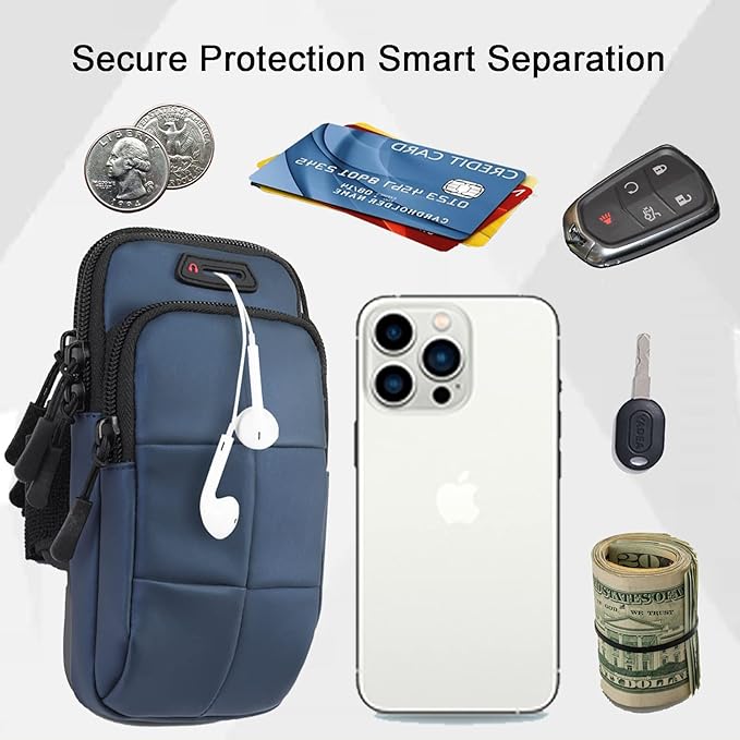 - [Secure Protection]This running armband with double deck and double zipper exercise pouch provides large and safe space for your cellphone as well as your house or car keys, ID/credit cards, cash, earphone, iPod & other accessories whilst doing outdoor activities. Never worry about losing them. Also, headphone and charger cutouts allow convenient access to the phone for hands free and listening music.