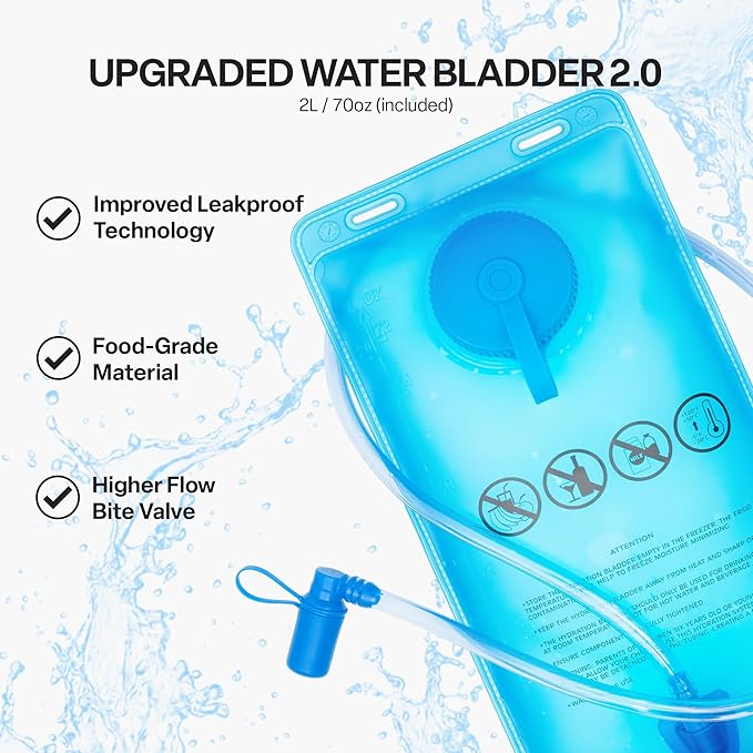 - EFFICIENT HYDRATION SYSTEM: This 18L hydration backpack includes an UPGRADED 70 oz / 2-LITER water bladder made of FOOD-GRADE PEVA material, along with a high-flow bite valve. The mouthpiece cover protects the bite valve against dirt and damage. The 2-LITER bladder is replaceable and supports up to 3-LITER / 100 oz.