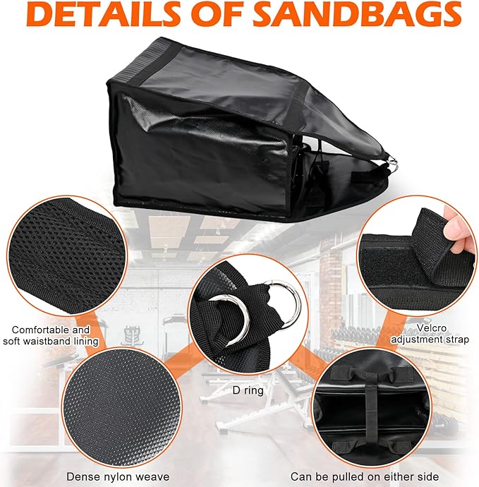 - Unique Design - The materials in the sandbag are hefty, and well made. This is a bag you drag on the ground. It comes with 4 weight bags, that can be filled to 20lbs each. But you don't have to just go in 10-20-30 intervals, The more weight you drag, the more you work and the stronger your legs become
