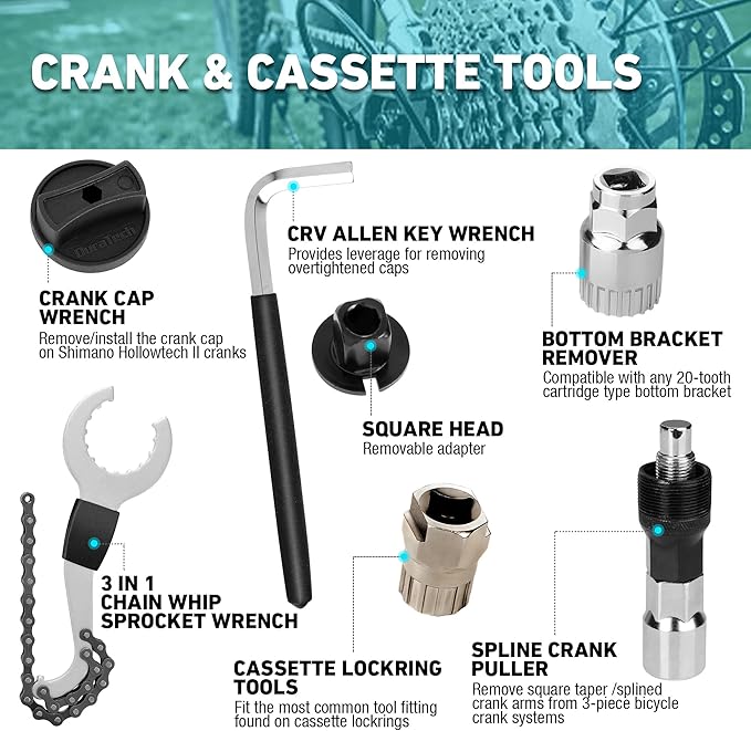 - Complete Kit: Our Bike tool kit includes everything you need to perform both major or delicate work without having to go to bike shop. Contains tools for chain, crank, cassette, tire and more!