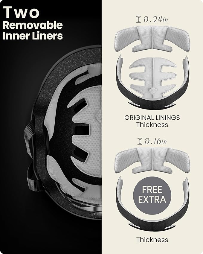 - Extra Removable Lining: Skateboard helmet with two removable liner for different head sizes and easy to wash the sweat away